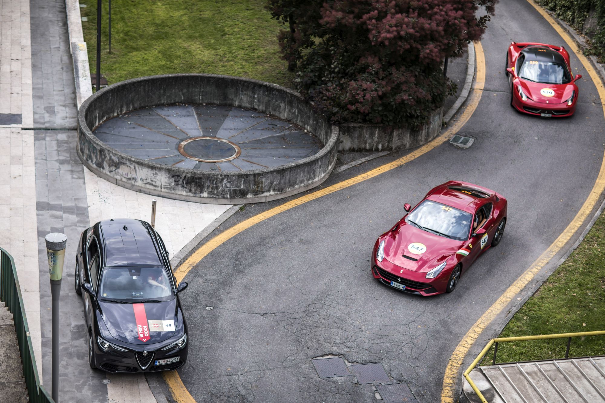 K fotce dole: dokonce jsme vyjeli i schody… A nemyslím ty, po kterých jede Stelvio na fotografii, ale ty za rohem. Zcela bez zaváhání při prukluzu kol!