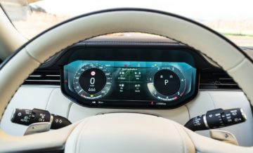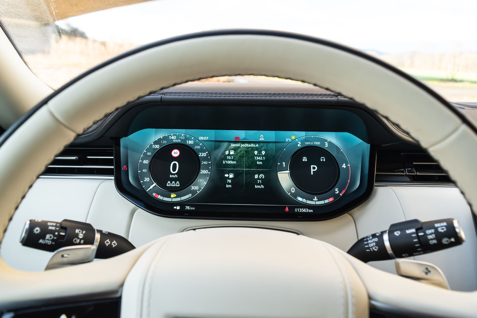 Právě v interiéru začneme – celkově je proti minulé generaci patrný značný posun v kvalitě materiálů a stylu. Interiér je obložen kůží, nechybí dřevěné či hliníkové dekory. Range Rover logicky neunikl digitalizaci – digitální přístrojový štít s tradičním tvarem „budíků“ se mi líbí, stejně jako zakřivený středový displej (úhlopříčka 13,1 palce) s elegantní grafikou a dobrou funkčností i rychlostí. Na ovládání jsem si zvyknul rychle. Navíc rychlou volbou objevuji obrazovku, která umožňuje vypnout start-stop a případně také systém ESP (což jde jen v určitých režimech pohonu všech kol). Co se týče komfortu, není moc co vyknout. Tělo si hoví na měkkých sedadlech se všemi různými funkcemi, nechybí vyhřívané opěrky nebo minichladnička. Trochu méně mě baví neobvyklý tvar volantu – nic lepšího než tříramenná konfigurace není, tak proč ty experimenty?